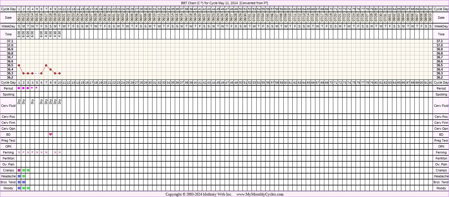 Disclaimer: You are viewing a chart shared by a MyMonthlyCycles member. All data on this chart, including ovulation date, if shown, has been entered by this member. MyMonthlyCycles has not interpreted this chart.